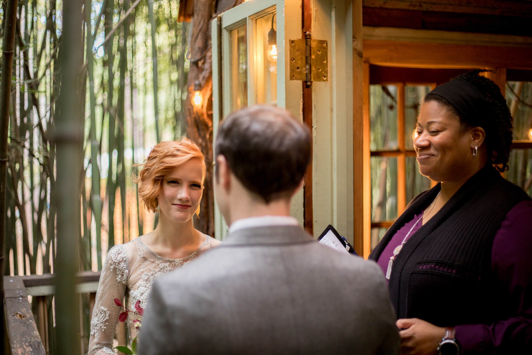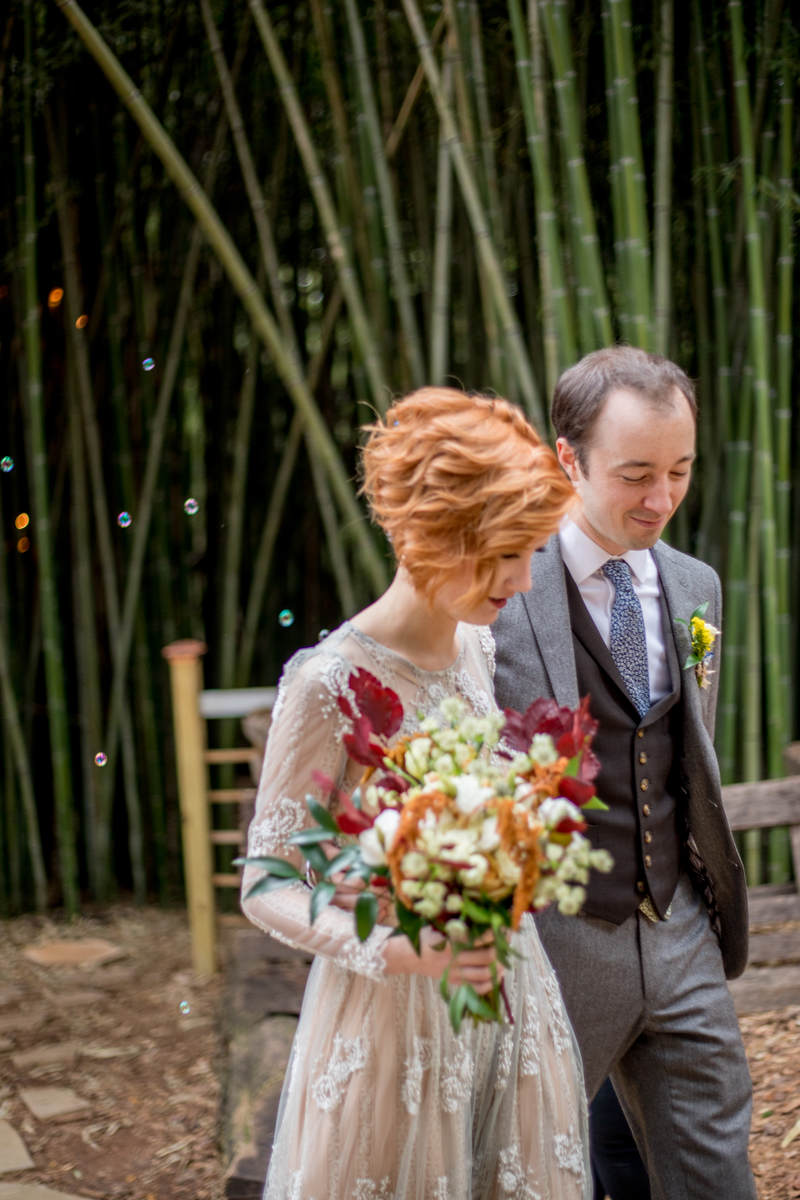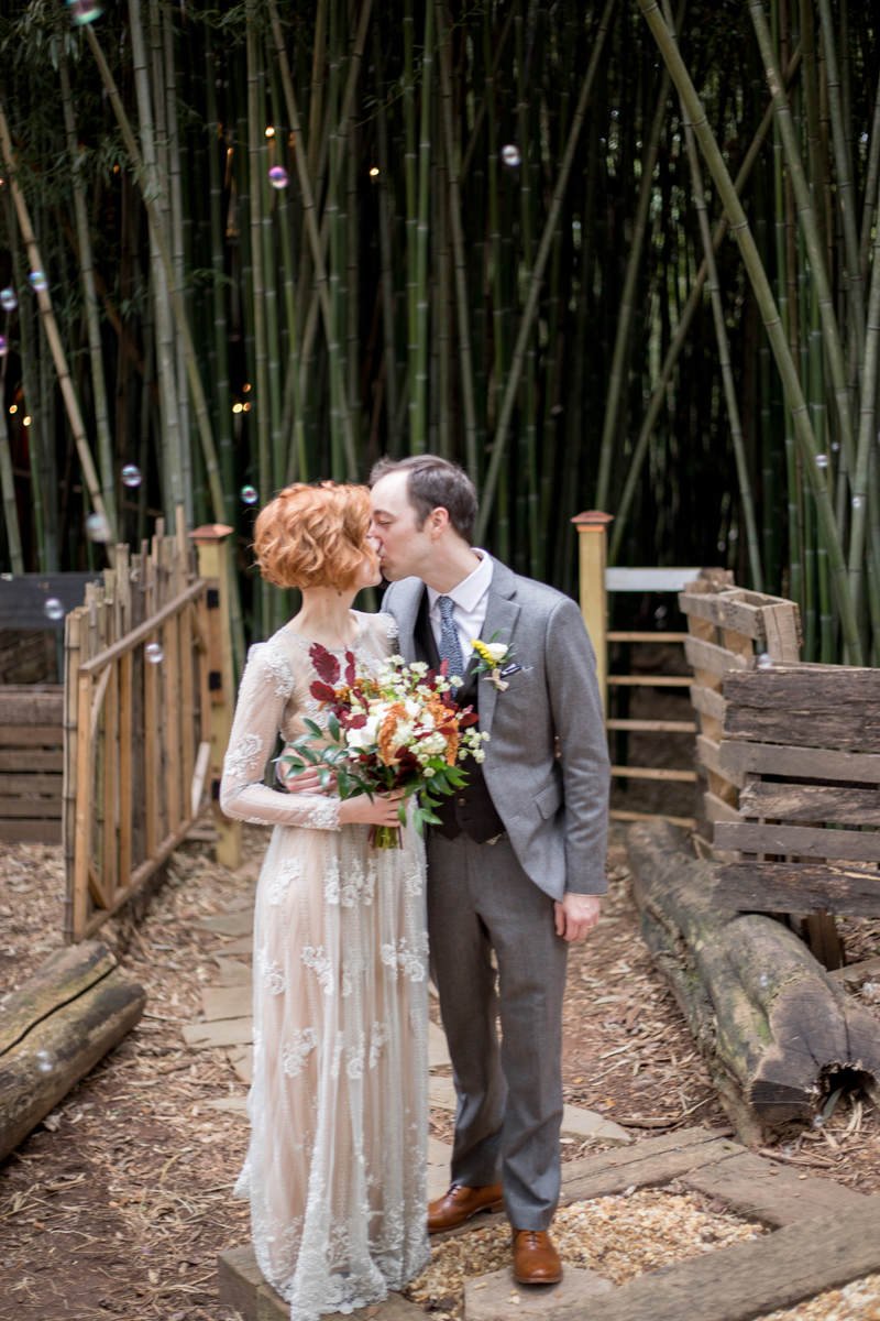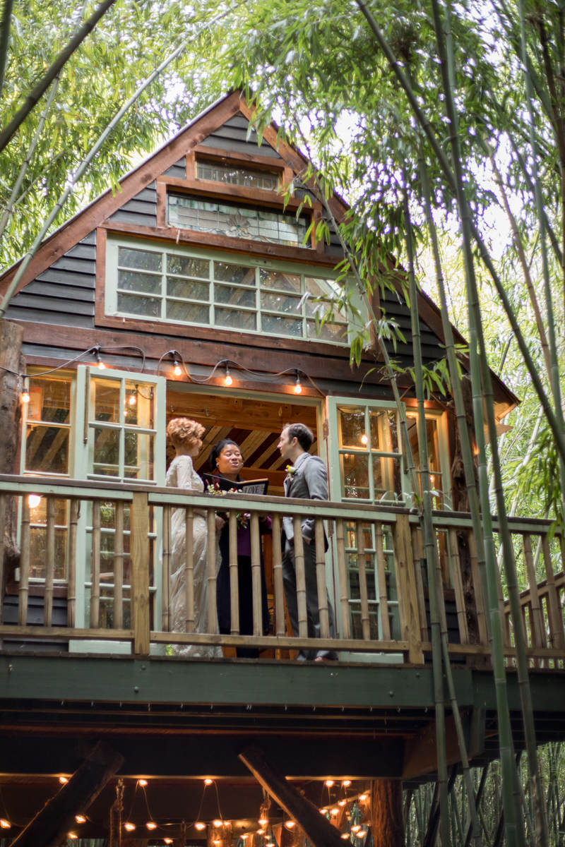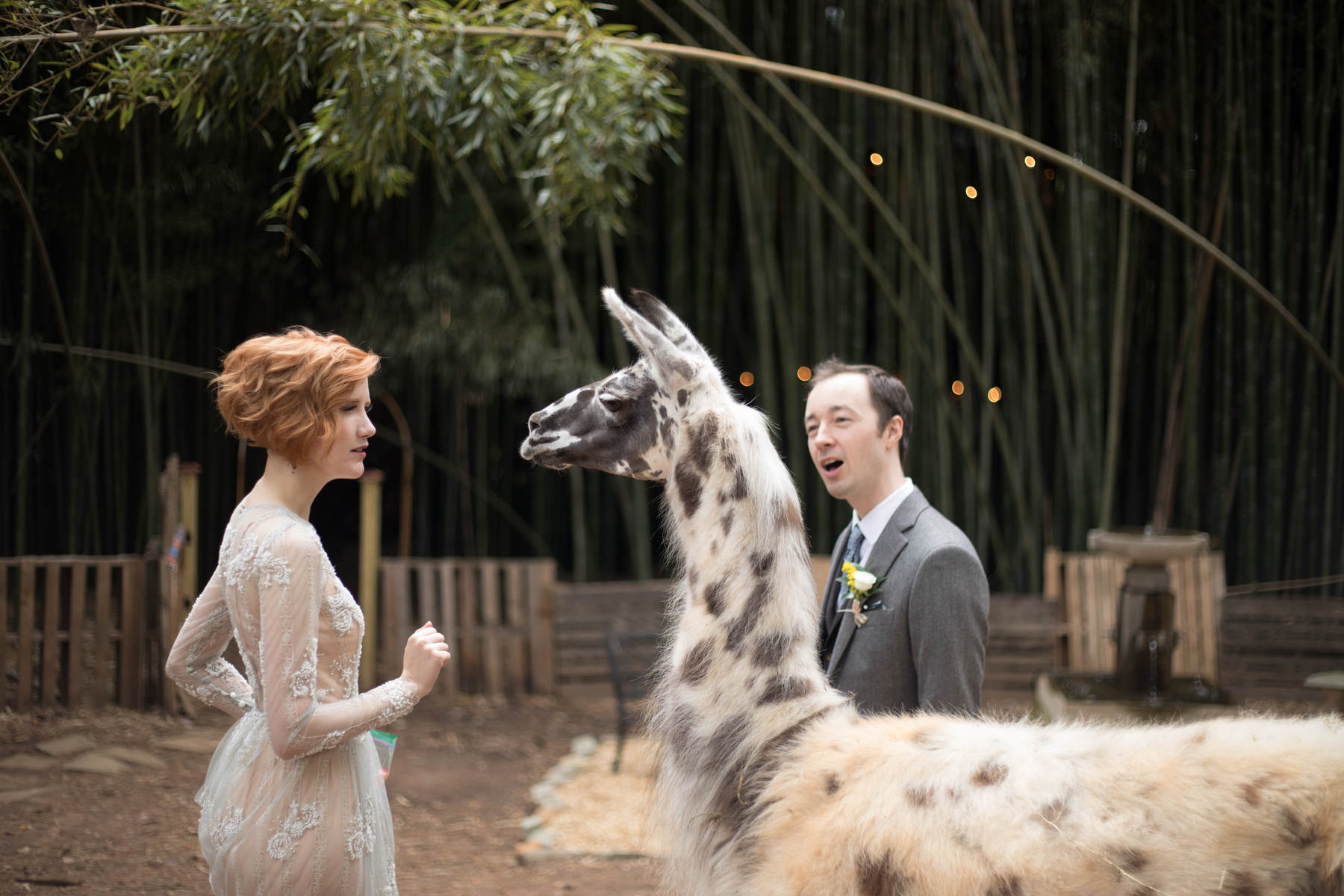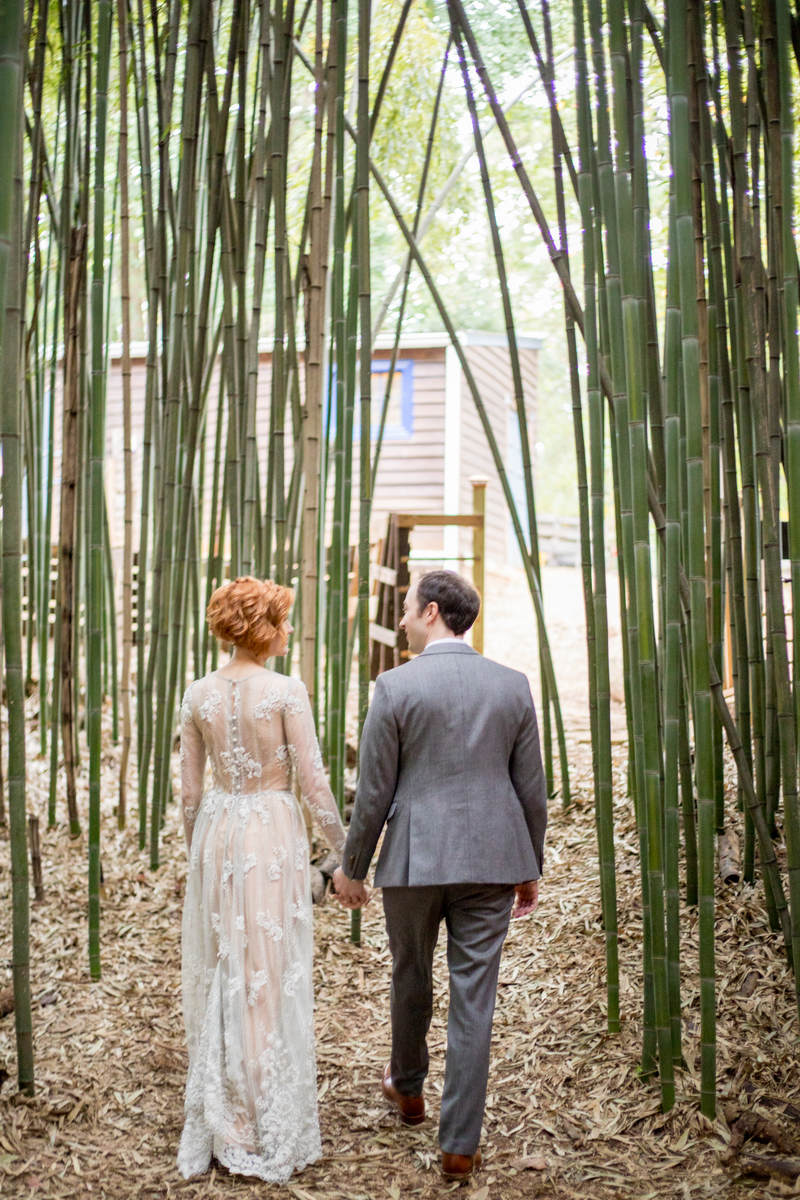 at the Alpaca Treehouse in the Bamboo forest. Their unique fall style was set beautifully against the green bamboo.This low-key ceremony was full of love and tasty snack packs for the animals!